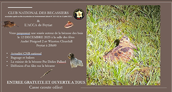 Le Club National des Bécassiers et l’ACCA de Feytiat vous invitent à une soirée autour de la bécasse des bois le 12 décembre 2025.